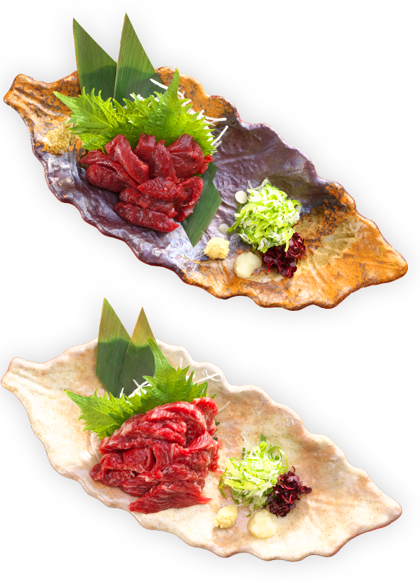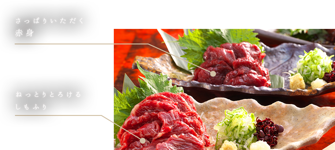 しもふり、赤身、ユッケの3種の馬刺しをご用意。新鮮な馬肉のみ生でご提供しています。やはり産地直送だから鮮度が違います。それぞれの違いを楽しんでください。